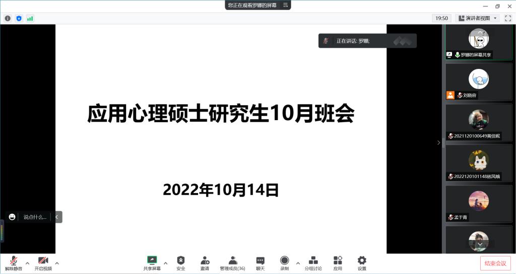 10月14日晚,tyc122ccVIP召开了应用心理硕士研究生10月主题班会,会议由班主任罗娜主持,全体研究生参会。会上,罗娜组织全体研究生学习了贵州省教育厅和《关于恢复线下教学相关工作的通知》(校疫防办发〔2022〕25号)文件精神,并对近期疫情防控、恢复研究生线下教学、研究生安全稳定等工作进行安排部署。会议强调,首…