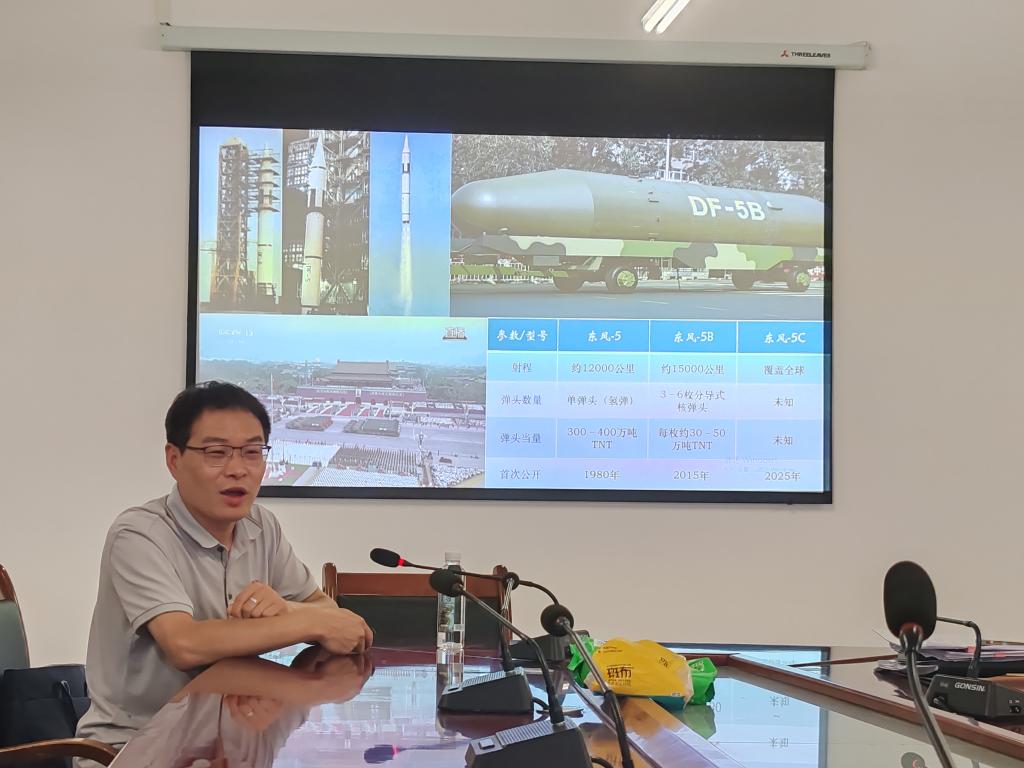 聚焦新时代中国国防和军队建设历史性功绩,杨明副教授着重剖析了2025年“9·3”阅兵及近年阅兵所展示的重磅武器装备及其战略价值。从“辽宁舰”到完全自主研制的“山东舰”和“福建舰”,中国造船工业和国防科技取得了飞速发展。同时,阅兵展示的隐形战斗机和洲际弹道导弹等军事装备的性能优化、更新换代,不仅是国防现代化的物质保障,更展现了我国战略威慑与体系化作战能力的显著提升。他指出,大国重器是捍卫国家主权、安全与发展权益的战略根基。