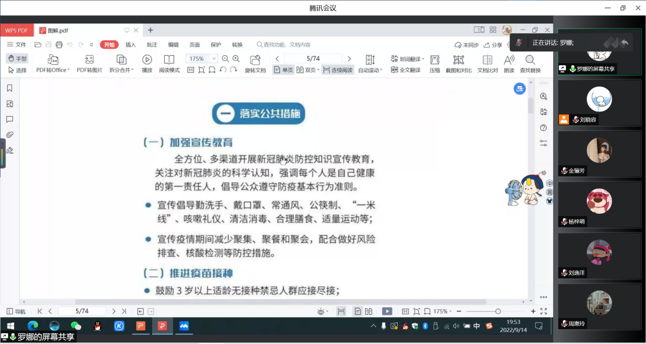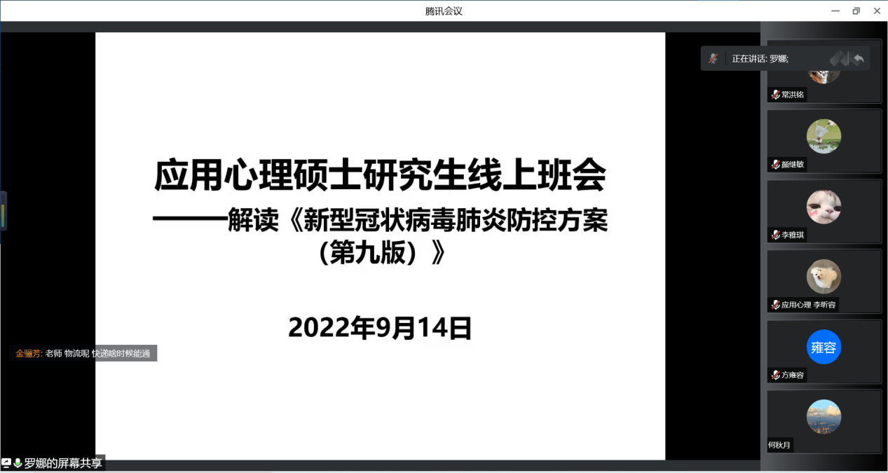 9月初,突如其来的新冠肺炎疫情打乱了大公司园生活,喧嚣的校园迅速进入静默状态。为响应公司的号召,做好新冠疫情防控工作,应用心理硕士研究生班主任罗娜于9月14日使用网络在线平台召开疫情防控教育主题班会。全体研究生参加会议。