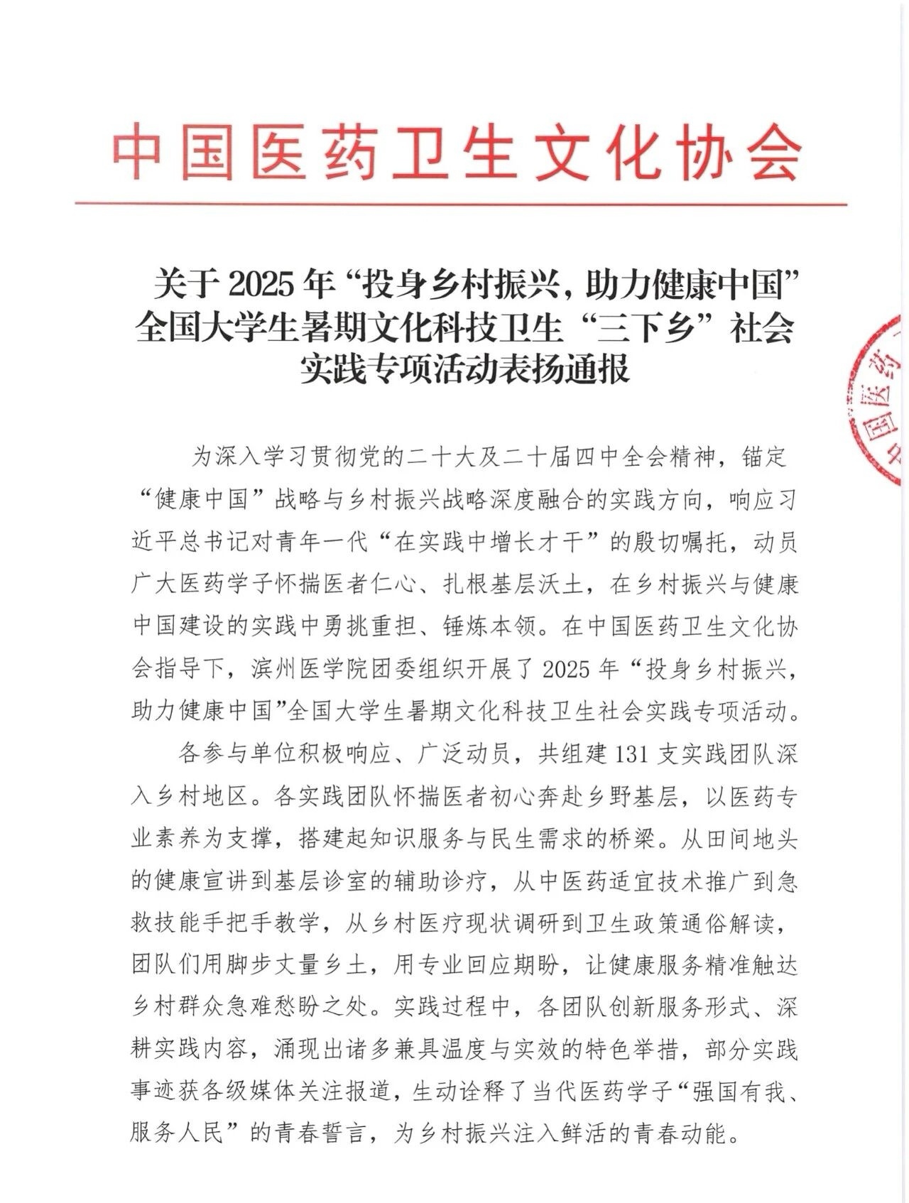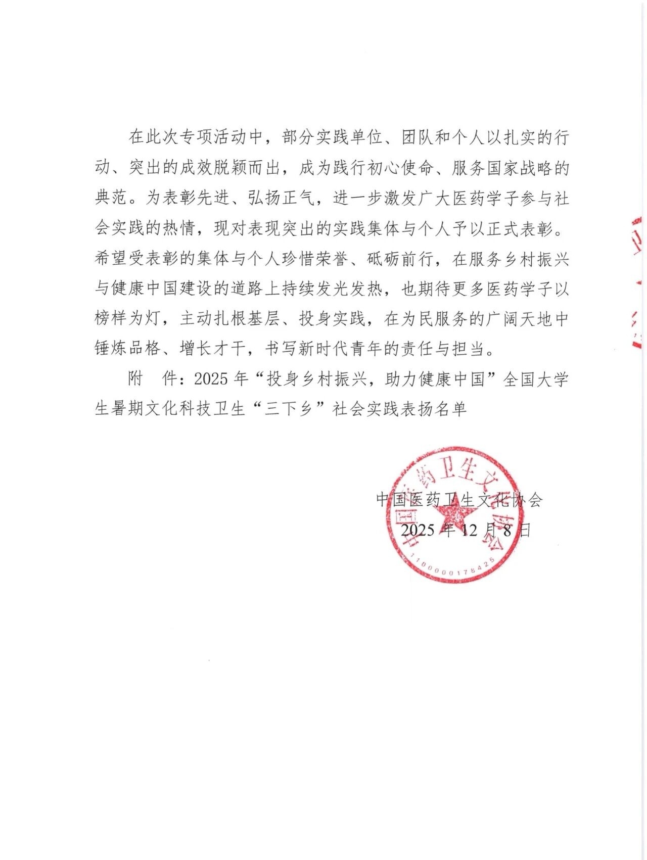 此前,公司积极响应活动号召,在公司和校团委支持下精心筹备申报,获全国专项立项。在全国131支入围实践团队的激烈角逐中,公司师生凭借优异表现脱颖而出、载誉而归。此次表彰,既是对公司师生扎根乡村一线、以专业所长赋能健康乡村建设的高度认可,更是对公司深化实践育人工作的有力鞭策。